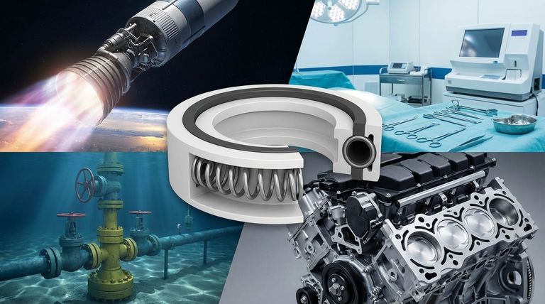 Em resumo, as vedações de PTFE energizadas por mola são usadas em quase todas as indústrias onde as vedações de elastômero padrão falham. Suas aplicações mais comuns são em Petróleo e Gás, Aeroespacial, Médica e Farmacêutica, Automotiva e Processamento Químico devido à sua capacidade única de lidar com condições operacionais extremas.