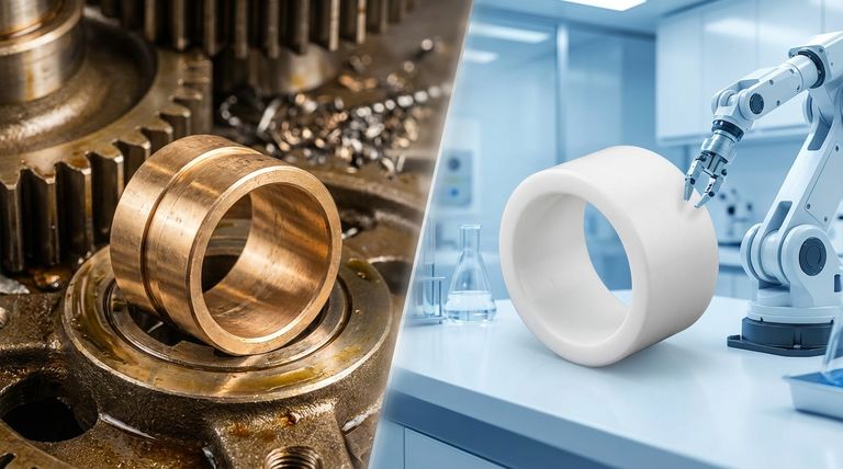 A escolha entre bronze e PTFE é uma troca de engenharia clássica. Você está selecionando força mecânica e resistência à temperatura elevadas (bronze) ou desempenho superior com baixo atrito, autolubrificação e operação silenciosa (PTFE).