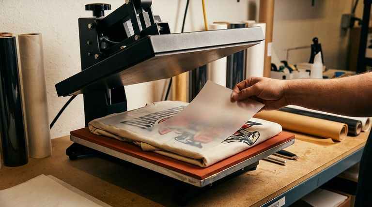 Para proteger tanto a sua peça de vestuário quanto o seu equipamento, você deve colocar uma folha de proteção antiaderente entre a camisa e a chapa superior quente da prensa térmica. O padrão da indústria para isso é uma folha de Teflon reutilizável, que atua como uma barreira fundamental para evitar que o tecido queime e impede que resíduos de tinta ou adesivo contaminem sua prensa.